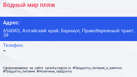 Водный мир, пляж по адресу 656043, Алтайский край, Барнаул, Правобережный тракт, 39 в дальнейшем Организация, размещена в следующих категориях: