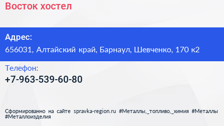 Восток, хостел по адресу 656031, Алтайский край, Барнаул, Шевченко, 170 к2 в дальнейшем Организация, размещена в следующих категориях: