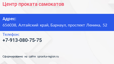 Центр проката самокатов по адресу 656038, Алтайский край, Барнаул, проспект Ленина, 52 в дальнейшем Организация, размещена в следующих категориях:
