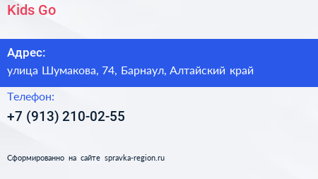 Kids Go по адресу улица Шумакова, 74, Барнаул, Алтайский край в дальнейшем Организация, размещена в следующих категориях: