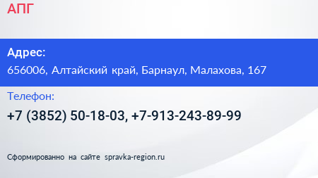 АПГ по адресу 656006, Алтайский край, Барнаул, Малахова, 167 в дальнейшем Организация, размещена в следующих категориях: