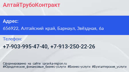 АлтайТрубоКонтракт по адресу 656922, Алтайский край, Барнаул, Звёздная, 6а в дальнейшем Организация, размещена в следующих категориях:
