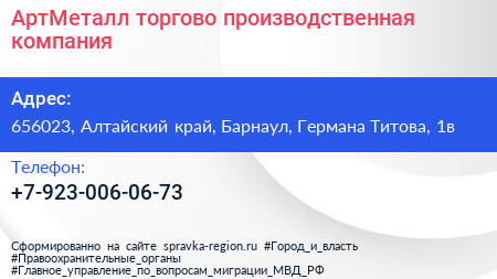 АртМеталл, торгово-производственная компания по адресу 656023, Алтайский край, Барнаул, Германа Титова, 1в в дальнейшем Организация, размещена в следующих категориях: