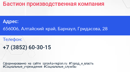 Бастион, производственная компания по адресу 656006, Алтайский край, Барнаул, Гридасова, 28 в дальнейшем Организация, размещена в следующих категориях: