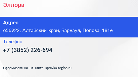 Эллора по адресу 656922, Алтайский край, Барнаул, Попова, 181е в дальнейшем Организация, размещена в следующих категориях: