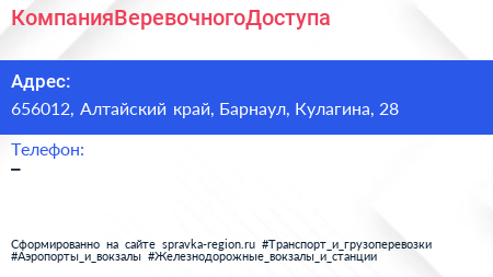 КомпанияВеревочногоДоступа по адресу 656012, Алтайский край, Барнаул, Кулагина, 28 в дальнейшем Организация, размещена в следующих категориях: