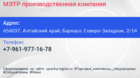 МЭТР, производственная компания по адресу 656037, Алтайский край, Барнаул, Северо-Западная, 2/14 в дальнейшем Организация, размещена в следующих категориях: