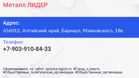Металл ЛИДЕР по адресу 656012, Алтайский край, Барнаул, Маяковского, 18в в дальнейшем Организация, размещена в следующих категориях: