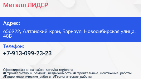 Металл ЛИДЕР по адресу 656922, Алтайский край, Барнаул, Новосибирская улица, 48Б в дальнейшем Организация, размещена в следующих категориях: