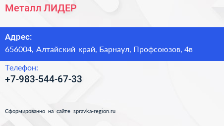 Металл ЛИДЕР по адресу 656004, Алтайский край, Барнаул, Профсоюзов, 4в в дальнейшем Организация, размещена в следующих категориях: