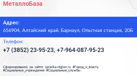 МеталлоБаза по адресу 656904, Алтайский край, Барнаул, Опытная станция, 20Б в дальнейшем Организация, размещена в следующих категориях:
