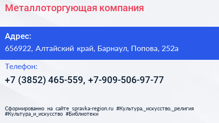 Металлоторгующая компания по адресу 656922, Алтайский край, Барнаул, Попова, 252а в дальнейшем Организация, размещена в следующих категориях:
