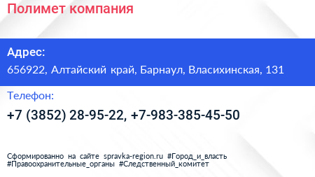 Полимет, компания по адресу 656922, Алтайский край, Барнаул, Власихинская, 131 в дальнейшем Организация, размещена в следующих категориях: