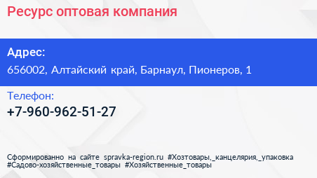 Ресурс, оптовая компания по адресу 656002, Алтайский край, Барнаул, Пионеров, 1 в дальнейшем Организация, размещена в следующих категориях: