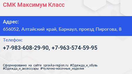 СМК Максимум Класс по адресу 656052, Алтайский край, Барнаул, проезд Пирогова, 8 в дальнейшем Организация, размещена в следующих категориях: