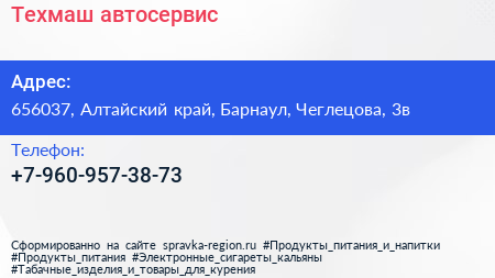 Техмаш, автосервис по адресу 656037, Алтайский край, Барнаул, Чеглецова, 3в в дальнейшем Организация, размещена в следующих категориях: