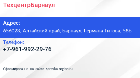 ТехцентрБарнаул по адресу 656023, Алтайский край, Барнаул, Германа Титова, 58Б в дальнейшем Организация, размещена в следующих категориях: