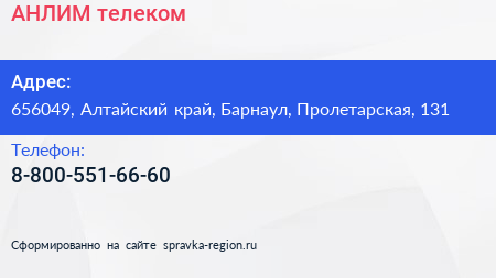 АНЛИМ телеком по адресу 656049, Алтайский край, Барнаул, Пролетарская, 131 в дальнейшем Организация, размещена в следующих категориях:
