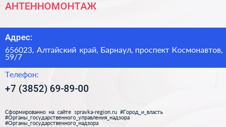 АНТЕННОМОНТАЖ по адресу 656023, Алтайский край, Барнаул, проспект Космонавтов, 59/7 в дальнейшем Организация, размещена в следующих категориях: