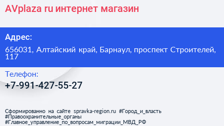 AVplaza.ru, интернет-магазин по адресу 656031, Алтайский край, Барнаул, проспект Строителей, 117 в дальнейшем Организация, размещена в следующих категориях: