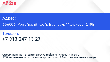 Айбэа по адресу 656006, Алтайский край, Барнаул, Малахова, 149Б в дальнейшем Организация, размещена в следующих категориях: