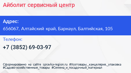 Для связи с организацией воспользуйтесь номером телефона: +7 (3852) 69-03-97. Пн: c 10:00-19:00, Вт: c 10:00-19:00, Ср: c 10:00-19:00, Чт: c 10:00-19:00, Пт: c 10:00-19:00, Сб: c 10:00-19:00, Вс: выходной, вы можете обратиться в эту организацию.