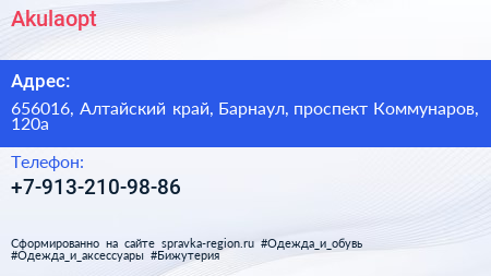 Akulaopt по адресу 656016, Алтайский край, Барнаул, проспект Коммунаров, 120а в дальнейшем Организация, размещена в следующих категориях: