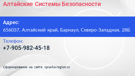 Алтайские Системы Безопасности по адресу 656037, Алтайский край, Барнаул, Северо-Западная, 28Б в дальнейшем Организация, размещена в следующих категориях: