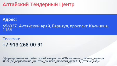 Алтайский Тендерный Центр по адресу 656037, Алтайский край, Барнаул, проспект Калинина, 116Б в дальнейшем Организация, размещена в следующих категориях: