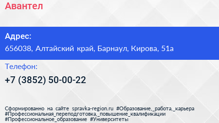 Авантел по адресу 656038, Алтайский край, Барнаул, Кирова, 51а в дальнейшем Организация, размещена в следующих категориях: