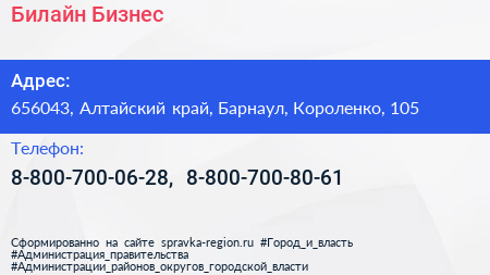 Билайн Бизнес по адресу 656043, Алтайский край, Барнаул, Короленко, 105 в дальнейшем Организация, размещена в следующих категориях: