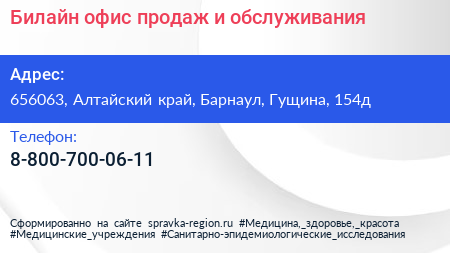 Билайн, офис продаж и обслуживания по адресу 656063, Алтайский край, Барнаул, Гущина, 154д в дальнейшем Организация, размещена в следующих категориях: