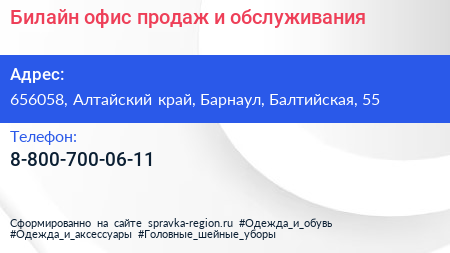 Билайн, офис продаж и обслуживания по адресу 656058, Алтайский край, Барнаул, Балтийская, 55 в дальнейшем Организация, размещена в следующих категориях: