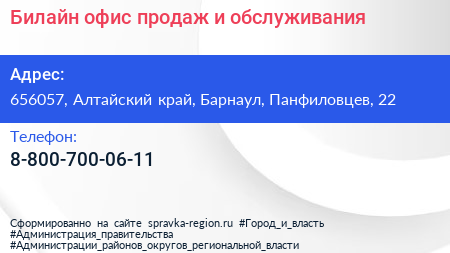 Билайн, офис продаж и обслуживания по адресу 656057, Алтайский край, Барнаул, Панфиловцев, 22 в дальнейшем Организация, размещена в следующих категориях: