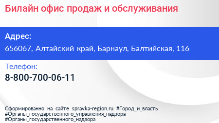 Билайн, офис продаж и обслуживания по адресу 656067, Алтайский край, Барнаул, Балтийская, 116 в дальнейшем Организация, размещена в следующих категориях: