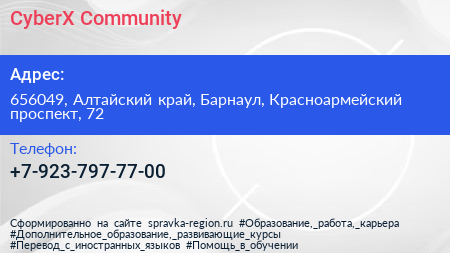 CyberX Community по адресу 656049, Алтайский край, Барнаул, Красноармейский проспект, 72 в дальнейшем Организация, размещена в следующих категориях: