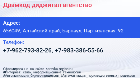 Драмкод-диджитал, агентство по адресу 656049, Алтайский край, Барнаул, Партизанская, 92 в дальнейшем Организация, размещена в следующих категориях: