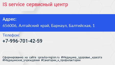 IS service, сервисный центр по адресу 656006, Алтайский край, Барнаул, Балтийская, 1 в дальнейшем Организация, размещена в следующих категориях: