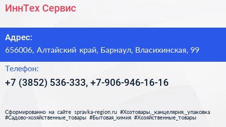 ИннТех-Сервис по адресу 656006, Алтайский край, Барнаул, Власихинская, 99 в дальнейшем Организация, размещена в следующих категориях: