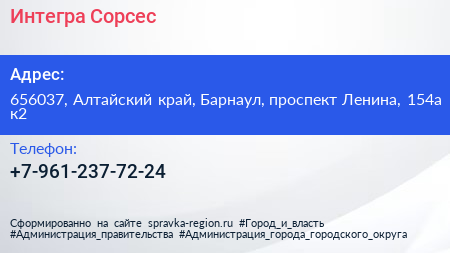 Интегра Сорсес по адресу 656037, Алтайский край, Барнаул, проспект Ленина, 154а к2 в дальнейшем Организация, размещена в следующих категориях: