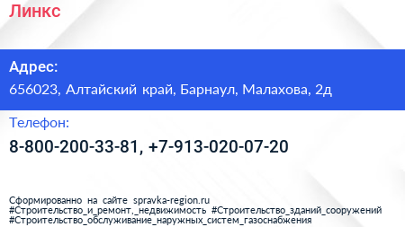 Линкс по адресу 656023, Алтайский край, Барнаул, Малахова, 2д в дальнейшем Организация, размещена в следующих категориях: