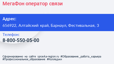 МегаФон, оператор связи по адресу 656922, Алтайский край, Барнаул, Фестивальная, 3 в дальнейшем Организация, размещена в следующих категориях: