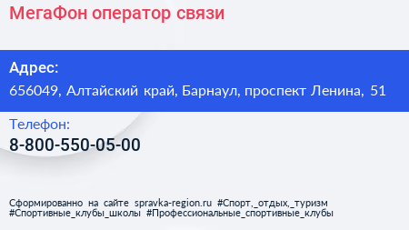 МегаФон, оператор связи по адресу 656049, Алтайский край, Барнаул, проспект Ленина, 51 в дальнейшем Организация, размещена в следующих категориях: