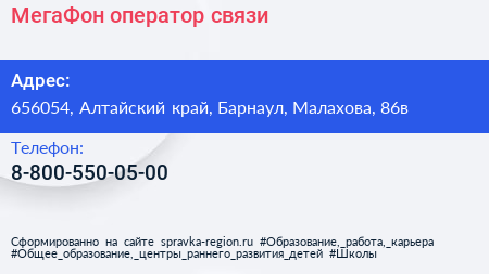 МегаФон, оператор связи по адресу 656054, Алтайский край, Барнаул, Малахова, 86в в дальнейшем Организация, размещена в следующих категориях: