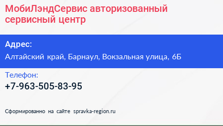 МобиЛэндСервис, авторизованный сервисный центр по адресу Алтайский край, Барнаул, Вокзальная улица, 6Б в дальнейшем Организация, размещена в следующих категориях:
