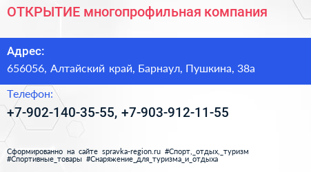 ОТКРЫТИЕ, многопрофильная компания по адресу 656056, Алтайский край, Барнаул, Пушкина, 38а в дальнейшем Организация, размещена в следующих категориях: