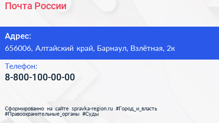 Почта России по адресу 656006, Алтайский край, Барнаул, Взлётная, 2к в дальнейшем Организация, размещена в следующих категориях: