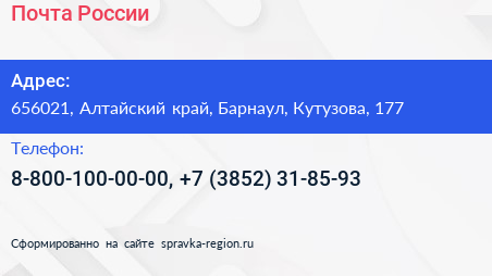 Почта России по адресу 656021, Алтайский край, Барнаул, Кутузова, 177 в дальнейшем Организация, размещена в следующих категориях: