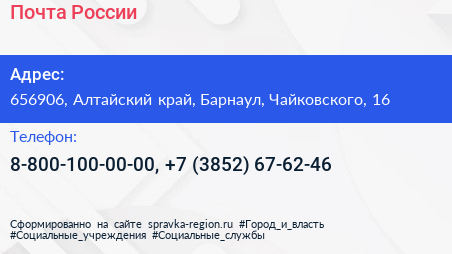 Почта России по адресу 656906, Алтайский край, Барнаул, Чайковского, 16 в дальнейшем Организация, размещена в следующих категориях: