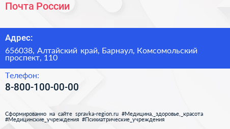 Почта России по адресу 656038, Алтайский край, Барнаул, Комсомольский проспект, 110 в дальнейшем Организация, размещена в следующих категориях: